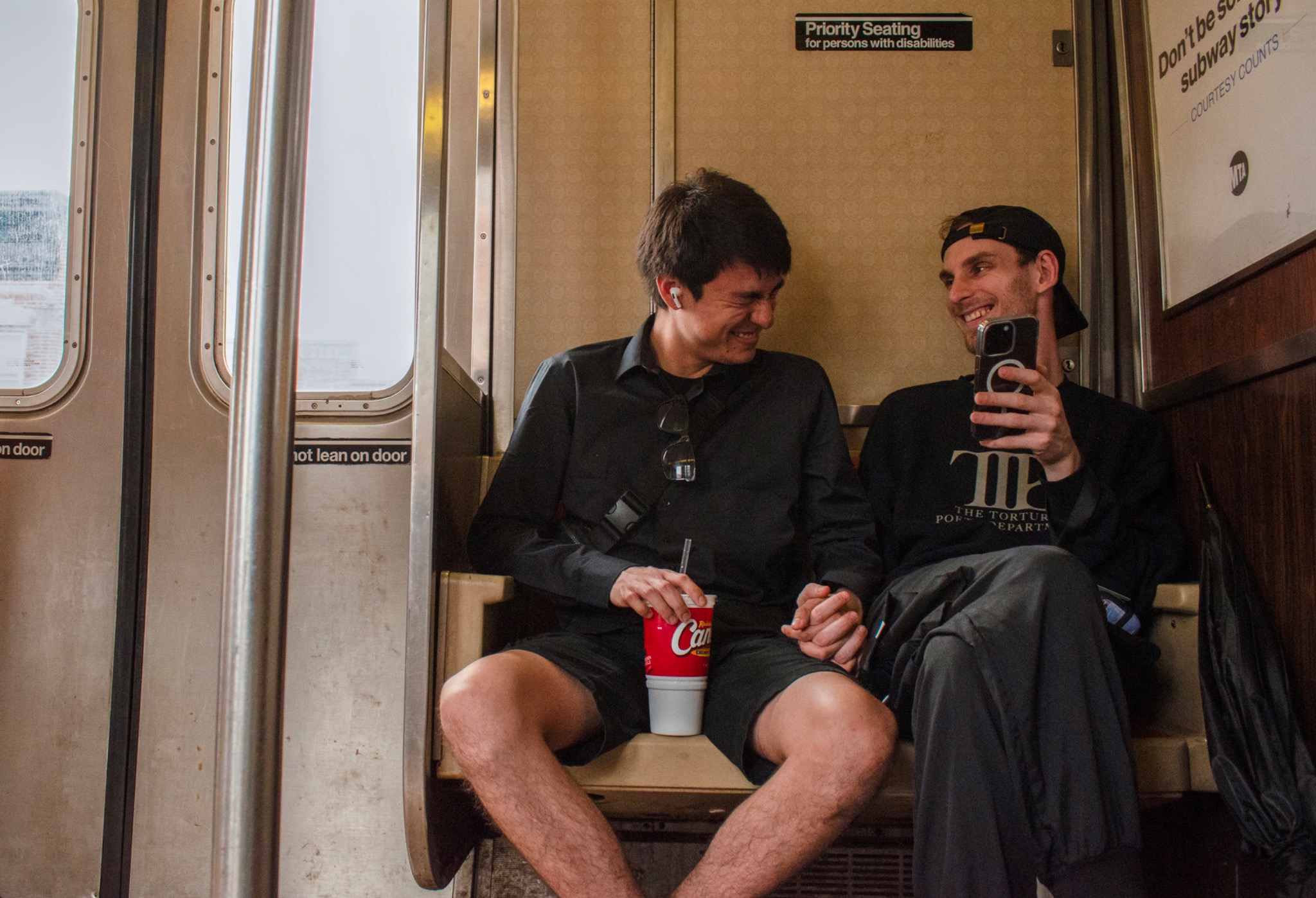 A couple holds hands while riding the Ditmars Boulevard-bound N train on May 13, 2025, in Astoria, Queens, New York.