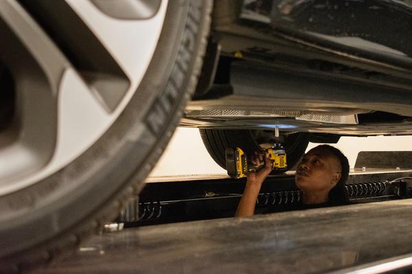 Shay Wiltshire, an intern at Land Rover and scholarship recipient, removes the splash shield from underneath a car on Nov. 6, 2025, at the Land Rover service center in Fort Worth. (McKinnon Rice | Fort Worth Report)