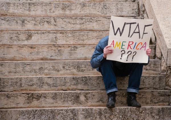 A protestor sits on the steps of the Denton County Courthouse on the Square while holding a sign at a Hands Off! protest on April 5, 2025, in Denton, Texas.