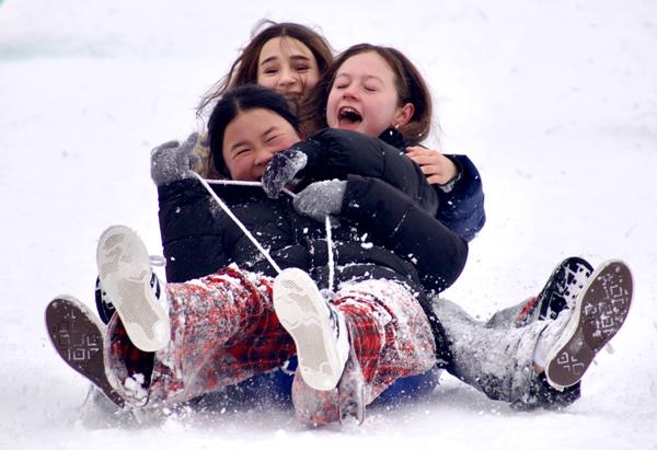Three girls sled down a hill in Owl's Head Park in Bay Ridge, Brooklyn on Dec. 27, 2025.